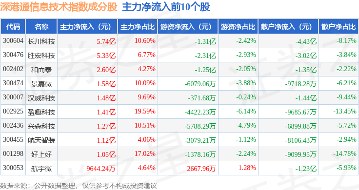 资金流向方面,深港通信息技术(983027)指数成份股当日主力资金净流出合计43.65亿元,游资资金净流出合计6.65亿元,散户资金净流入合计50.29亿元。成份股资金流向详情见下表: