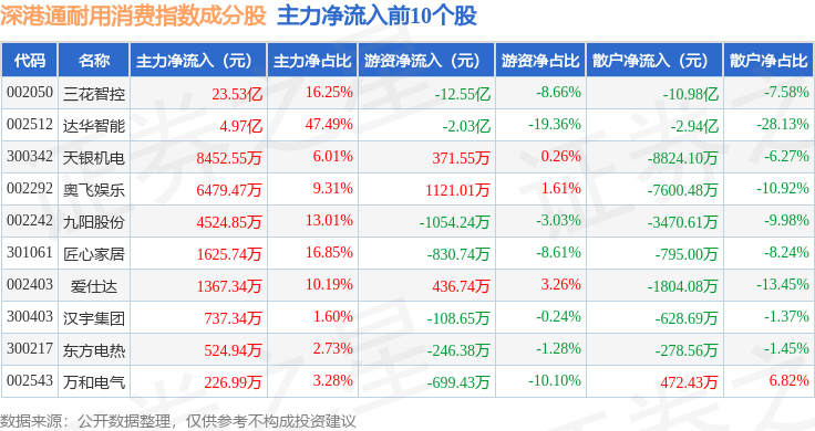 资金流向方面,深港通耐用消费(983049)指数成份股当日主力资金净流入合计26.52亿元,游资资金净流出合计15.73亿元,散户资金净流出合计10.79亿元。成份股资金流向详情见下表: