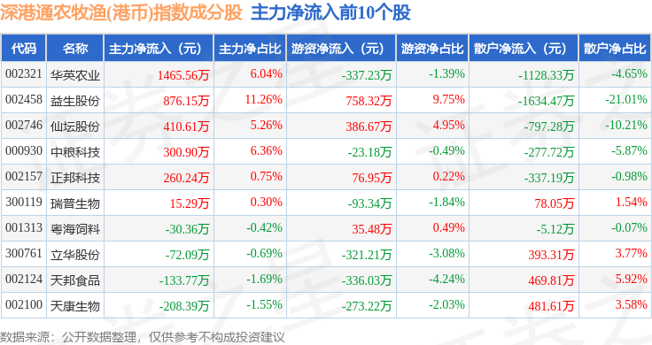 资金流向方面,深港通农牧渔(港币)(983052)指数成份股当日主力资金净流出合计3.91亿元,游资资金净流入合计1.54亿元,散户资金净流入合计2.36亿元。成份股资金流向详情见下表: