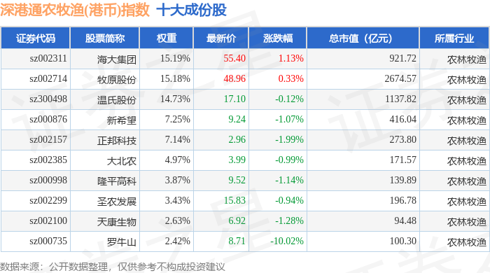 深港通农牧渔(港币)(983052)指数十大成份股详情如下:
