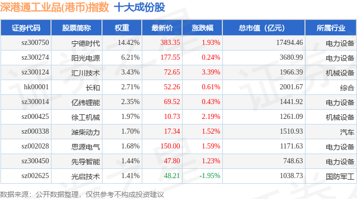 深港通工业品(港币)(983070)指数十大成份股详情如下: