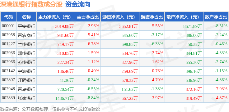 资金流向方面,深港通银行(983081)指数成份股当日主力资金净流入合计3125.1万元,游资资金净流入合计6624.67万元,散户资金净流出合计9749.77万元。成份股资金流向详情见下表: