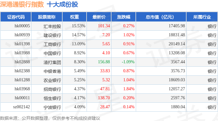 证券之星消息,12月4日,深港通银行(983081)指数报收于7590.09点,涨0.09%,成交73.77亿元,换手率0.17%。当日该指数成份股中,上涨的有18家,招商银行以1.84%的涨幅领涨,下跌的有9家,渣打集团以1.09%的跌幅领跌。