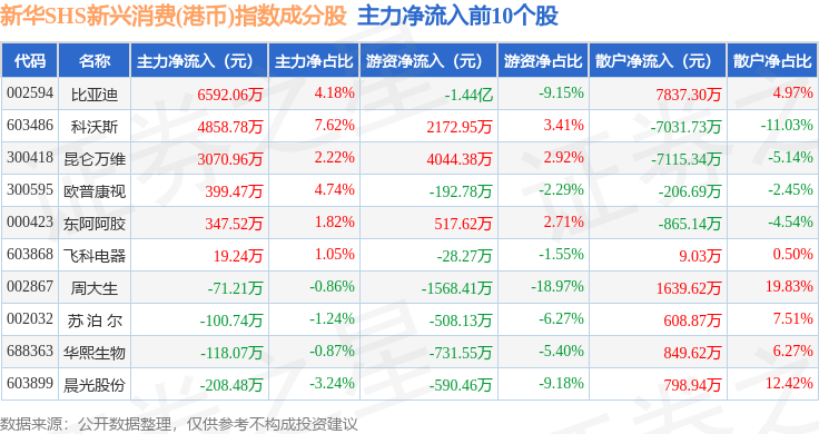 资金流向方面,新华SHS新兴消费(港币)(989007)指数成份股当日主力资金净流出合计6.6亿元,游资资金净流出合计1.92亿元,散户资金净流入合计8.52亿元。成份股资金流向详情见下表: