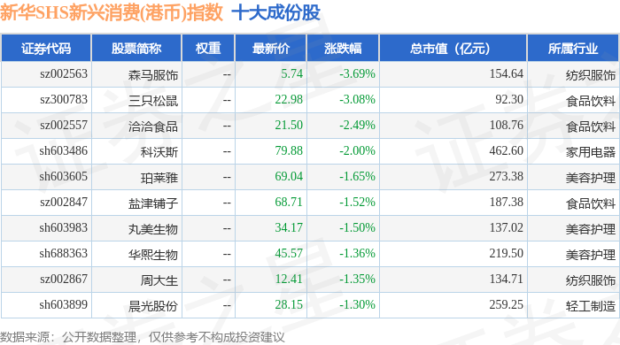 新华SHS新兴消费(港币)(989007)指数十大成份股详情如下: