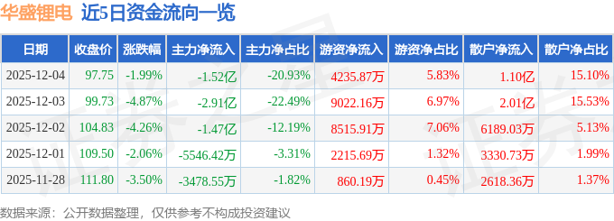 证券之星消息,截至2025年12月4日收盘,华盛锂电(688353)报收于97.75元,下跌1.99%,换手率6.16%,成交量7.34万手,成交额7.26亿元。