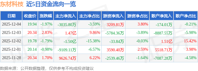 证券之星消息,截至2025年12月4日收盘,东材科技(601208)报收于19.94元,下跌1.97%,换手率4.14%,成交量42.16万手,成交额8.45亿元。