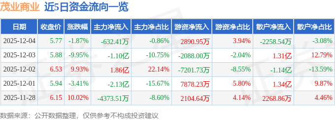 证券之星消息,截至2025年12月4日收盘,茂业商业(600828)报收于5.77元,下跌1.87%,换手率7.24%,成交量125.28万手,成交额7.34亿元。