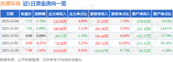 证券之星消息,截至2025年12月4日收盘,京源环保(688096)报收于7.71元,下跌1.78%,换手率1.48%,成交量3.49万手,成交额2714.2万元。