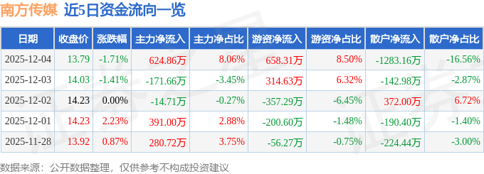 证券之星消息,截至2025年12月4日收盘,南方传媒(601900)报收于13.79元,下跌1.71%,换手率0.63%,成交量5.6万手,成交额7748.39万元。
