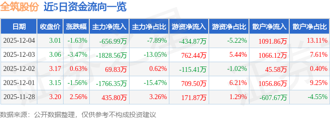 证券之星消息,截至2025年12月4日收盘,全筑股份(603030)报收于3.01元,下跌1.63%,换手率2.09%,成交量27.57万手,成交额8329.5万元。