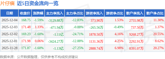 证券之星消息,截至2025年12月4日收盘,片仔癀(600436)报收于168.75元,下跌1.59%,换手率0.24%,成交量1.44万手,成交额2.44亿元。