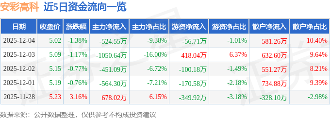 证券之星消息,截至2025年12月4日收盘,安彩高科(600207)报收于5.02元,下跌1.38%,换手率1.02%,成交量11.1万手,成交额5589.75万元。