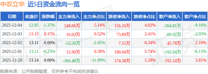 证券之星消息,截至2025年12月4日收盘,中农立华(603970)报收于12.95元,下跌1.37%,换手率0.83%,成交量2.22万手,成交额2892.43万元。