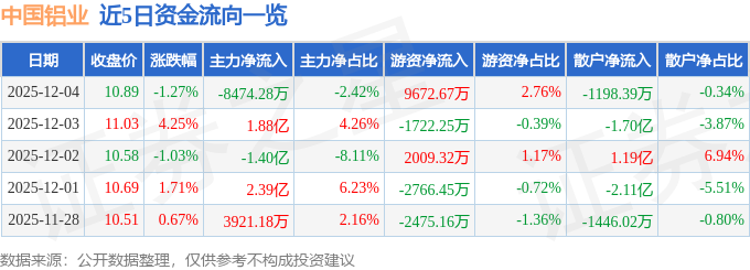 证券之星消息,截至2025年12月4日收盘,中国铝业(601600)报收于10.89元,下跌1.27%,换手率2.41%,成交量316.82万手,成交额35.02亿元。