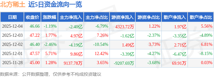 证券之星消息,截至2025年12月4日收盘,北方稀土(600111)报收于46.66元,下跌1.19%,换手率2.11%,成交量76.14万手,成交额35.33亿元。