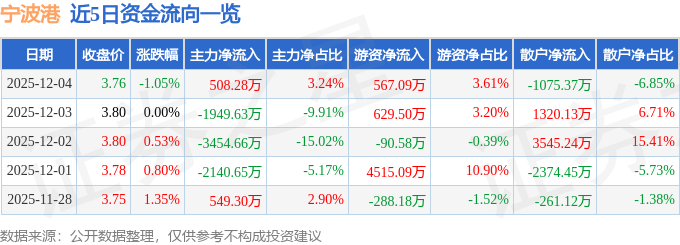 证券之星消息,截至2025年12月4日收盘,宁波港(601018)报收于3.76元,下跌1.05%,换手率0.21%,成交量41.52万手,成交额1.57亿元。