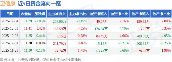 证券之星消息,截至2025年12月4日收盘,卫信康(603676)报收于11.29元,下跌1.05%,换手率0.46%,成交量2.01万手,成交额2281.91万元。