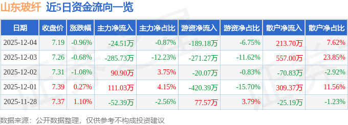 证券之星消息,截至2025年12月4日收盘,山东玻纤(605006)报收于7.19元,下跌0.96%,换手率0.65%,成交量3.9万手,成交额2802.63万元。