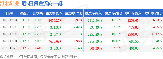 证券之星消息,截至2025年12月4日收盘,淮北矿业(600985)报收于11.88元,下跌0.92%,换手率0.58%,成交量15.57万手,成交额1.84亿元。