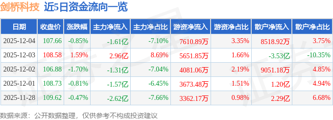 证券之星消息,截至2025年12月4日收盘,剑桥科技(603083)报收于107.66元,下跌0.85%,换手率7.73%,成交量21.3万手,成交额22.72亿元。