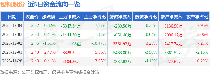 证券之星消息,截至2025年12月4日收盘,包钢股份(600010)报收于2.42元,下跌0.82%,换手率1.01%,成交量318.15万手,成交额7.72亿元。