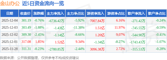 证券之星消息,截至2025年12月4日收盘,金山办公(688111)报收于301.19元,下跌0.76%,换手率0.81%,成交量3.77万手,成交额11.38亿元。