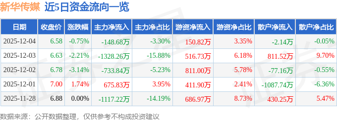 证券之星消息,截至2025年12月4日收盘,新华传媒(600825)报收于6.58元,下跌0.75%,换手率0.65%,成交量6.83万手,成交额4505.0万元。