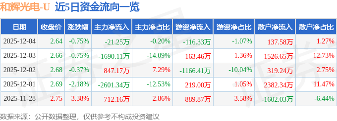 证券之星消息,截至2025年12月4日收盘,和辉光电(688538)报收于2.64元,下跌0.75%,换手率0.71%,成交量41.02万手,成交额1.08亿元。