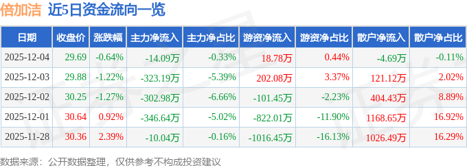 证券之星消息,截至2025年12月4日收盘,倍加洁(603059)报收于29.69元,下跌0.64%,换手率1.41%,成交量1.42万手,成交额4247.47万元。