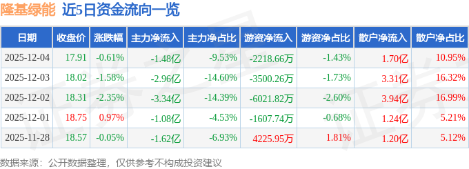 证券之星消息,截至2025年12月4日收盘,隆基绿能(601012)报收于17.91元,下跌0.61%,换手率1.15%,成交量86.87万手,成交额15.56亿元。