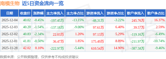 证券之星消息,截至2025年12月4日收盘,南模生物(688265)报收于40.02元,下跌0.45%,换手率0.48%,成交量3752.0手,成交额1501.03万元。
