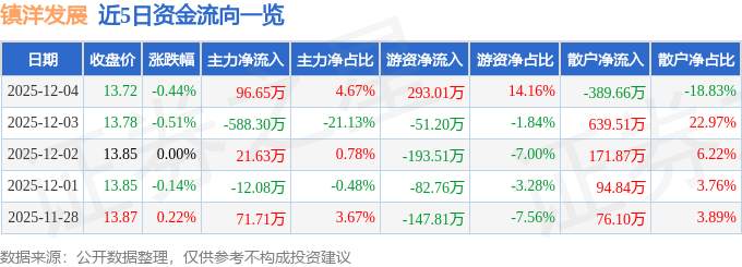 证券之星消息,截至2025年12月4日收盘,镇洋发展(603213)报收于13.72元,下跌0.44%,换手率0.34%,成交量1.51万手,成交额2069.43万元。