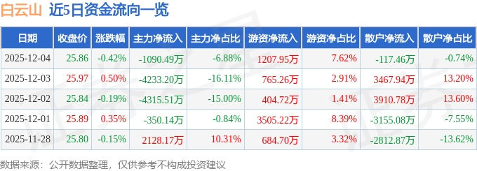 证券之星消息,截至2025年12月4日收盘,白云山(600332)报收于25.86元,下跌0.42%,换手率0.44%,成交量6.13万手,成交额1.58亿元。