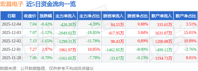 证券之星消息,截至2025年12月4日收盘,宏昌电子(603002)报收于7.04元,下跌0.42%,换手率1.2%,成交量13.63万手,成交额9576.24万元。