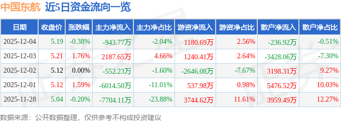 证券之星消息,截至2025年12月4日收盘,中国东航(600115)报收于5.19元,下跌0.38%,换手率0.53%,成交量89.41万手,成交额4.62亿元。