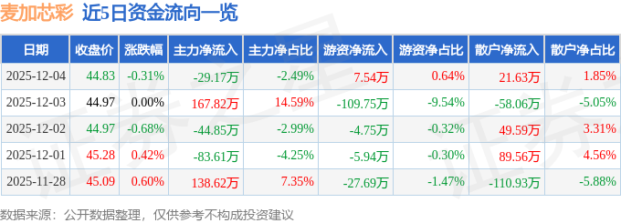 证券之星消息,截至2025年12月4日收盘,麦加芯彩(603062)报收于44.83元,下跌0.31%,换手率0.7%,成交量2608.0手,成交额1171.67万元。