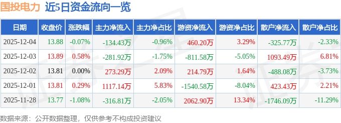证券之星消息,截至2025年12月4日收盘,国投电力(600886)报收于13.88元,下跌0.07%,换手率0.14%,成交量10.07万手,成交额1.4亿元。