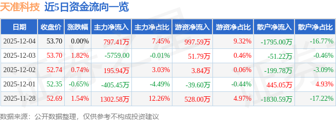 证券之星消息,截至2025年12月4日收盘,天准科技(688003)报收于53.7元,上涨0.0%,换手率1.03%,成交量2.0万手,成交额1.07亿元。