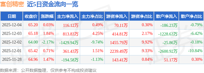 证券之星消息,截至2025年12月4日收盘,富创精密(688409)报收于65.2元,上涨0.03%,换手率1.19%,成交量3.65万手,成交额2.36亿元。