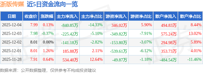 证券之星消息,截至2025年12月4日收盘,浙版传媒(601921)报收于7.99元,上涨0.13%,换手率0.33%,成交量7.34万手,成交额5866.38万元。