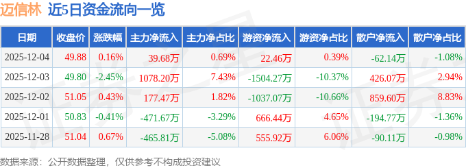 证券之星消息,截至2025年12月4日收盘,迈信林(688685)报收于49.88元,上涨0.16%,换手率0.79%,成交量1.16万手,成交额5771.78万元。