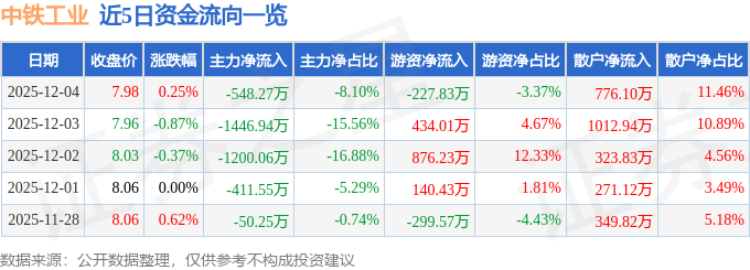 证券之星消息,截至2025年12月4日收盘,中铁工业(600528)报收于7.98元,上涨0.25%,换手率0.38%,成交量8.51万手,成交额6770.2万元。