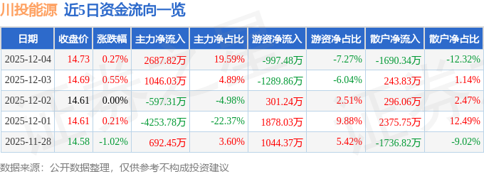 证券之星消息,截至2025年12月4日收盘,川投能源(600674)报收于14.73元,上涨0.27%,换手率0.19%,成交量9.34万手,成交额1.37亿元。