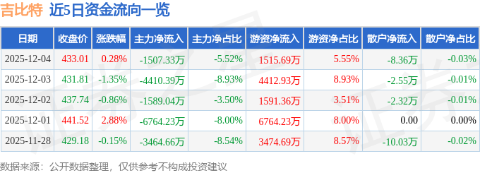 12月4日的资金流向数据方面,主力资金净流出1507.33万元,占总成交额5.52%,游资资金净流入1515.69万元,占总成交额5.55%,散户资金净流出8.36万元,占总成交额0.03%。