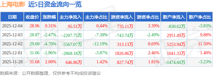 证券之星消息,截至2025年12月4日收盘,上海电影(601595)报收于28.96元,上涨0.31%,换手率1.67%,成交量7.47万手,成交额2.17亿元。