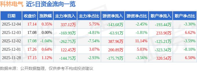 证券之星消息,截至2025年12月4日收盘,科林电气(603050)报收于17.14元,上涨0.35%,换手率0.85%,成交量3.41万手,成交额5863.08万元。