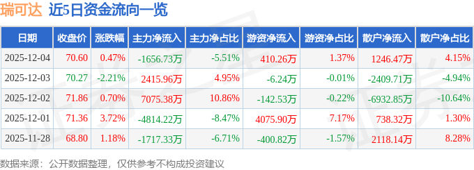 证券之星消息,截至2025年12月4日收盘,瑞可达(688800)报收于70.6元,上涨0.47%,换手率2.08%,成交量4.28万手,成交额3.01亿元。