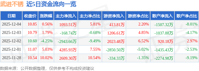 证券之星消息,截至2025年12月4日收盘,武进不锈(603878)报收于10.85元,上涨0.56%,换手率3.09%,成交量17.35万手,成交额1.88亿元。