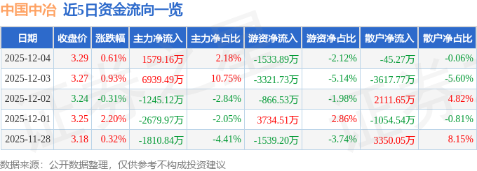 证券之星消息,截至2025年12月4日收盘,中国中冶(601618)报收于3.29元,上涨0.61%,换手率1.22%,成交量217.85万手,成交额7.24亿元。